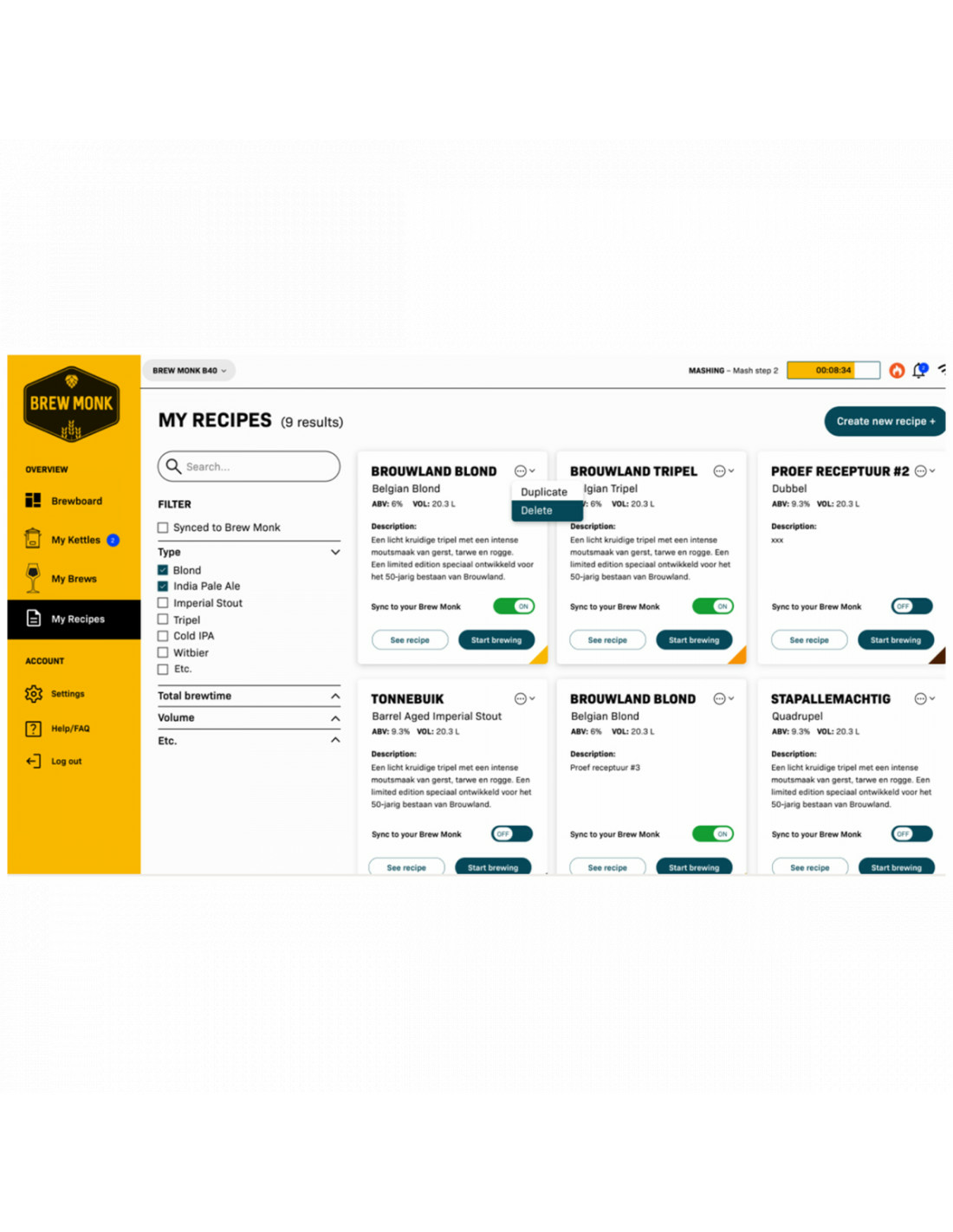Avec le nouveau Brew Monk™ B40, vous avez accès à la plateforme de brassage en ligne https://www.mybrewmonk.eu/. Cette plateforme vous offre de nombreuses possibilités pour stocker vos données de brassage et simplifier votre journée de brassage.