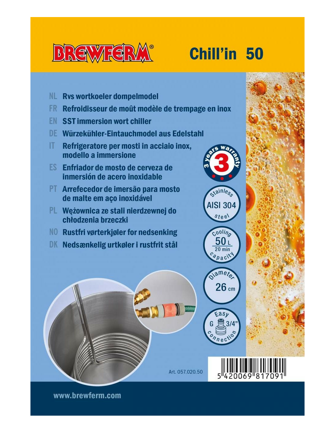 Ce refroidisseur de moût refroidit 50 litres de moût en ébullition en 20 minutes jusqu’à 20-25 °C, en utilisant l’eau de refroidissement de 13 °C.