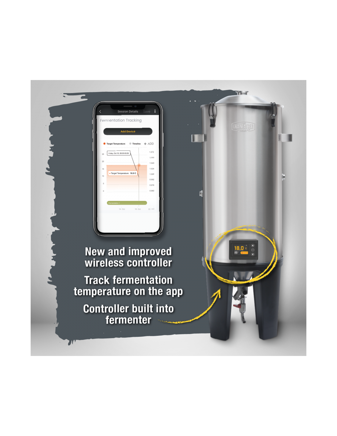 Le fermenteur conique édition professionnelle est doté d’un contrôleur intégré amélioré avec connectivité sans fil, qui vous permet de suivre la fermentation grâce à des alertes et des notifications automatisées, où que vous soyez, si une connexion internet est disponible.