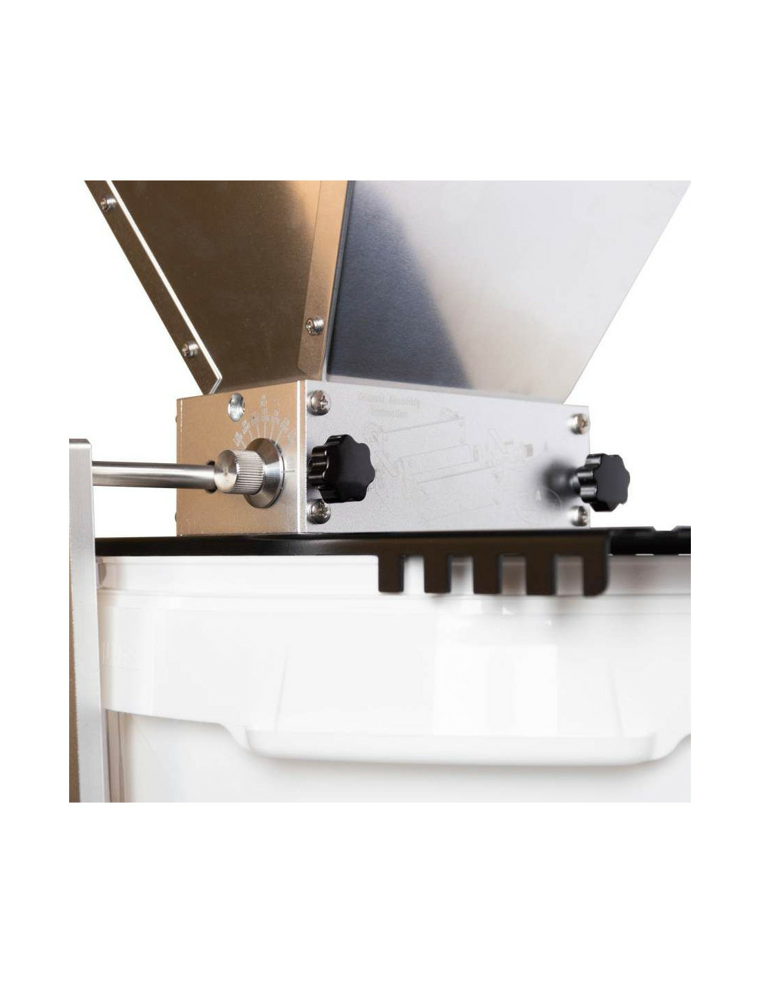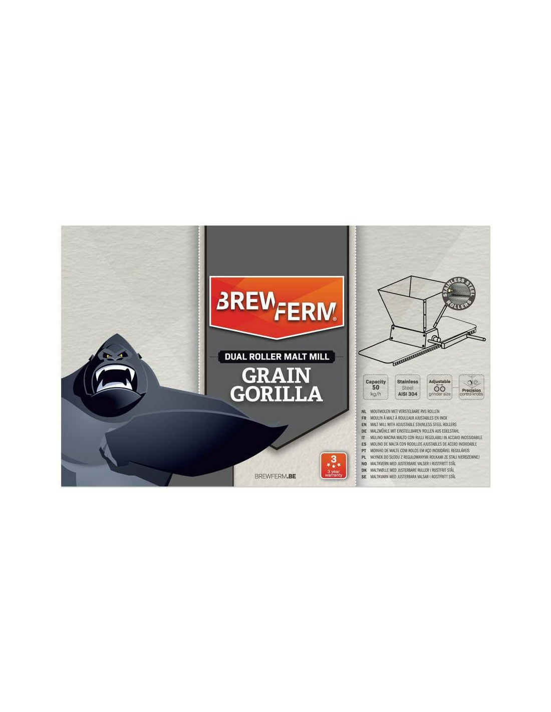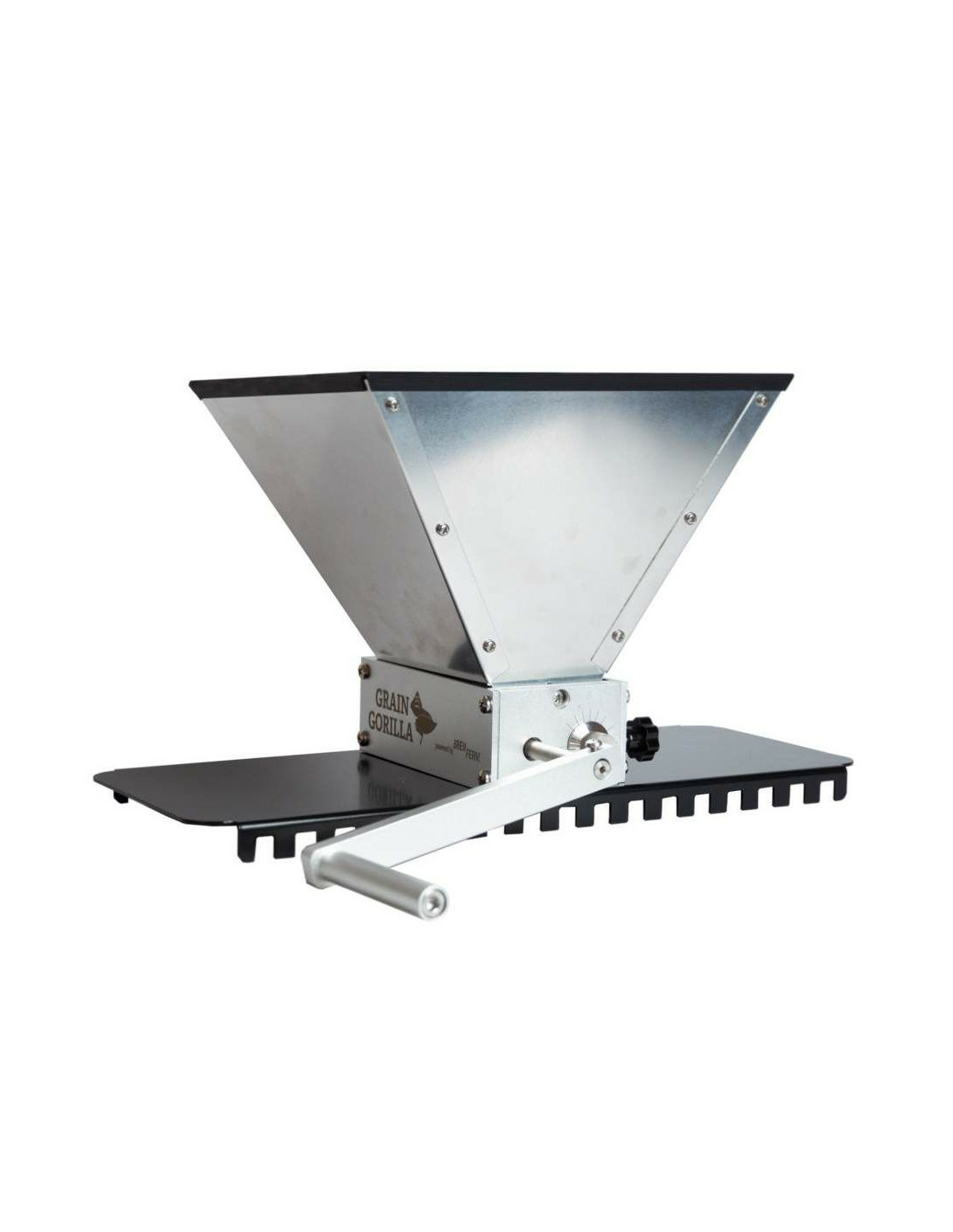 Grain Gorilla : le King Kong des moulins à malt. Les rouleaux réglables en acier inoxydable garantissent que votre malt est aussi finement concassé que vous le souhaitez. Grâce aux boutons pratiques sur le côté, vous pouvez régler facilement et instantanément l’écartement des rouleaux et ainsi l’épaisseur du malt concassé. Au dos du moulin à malt, les 2 ridoirs noirs garantissent que les réglages du moulin à malt restent les mêmes pendant le concassage.
