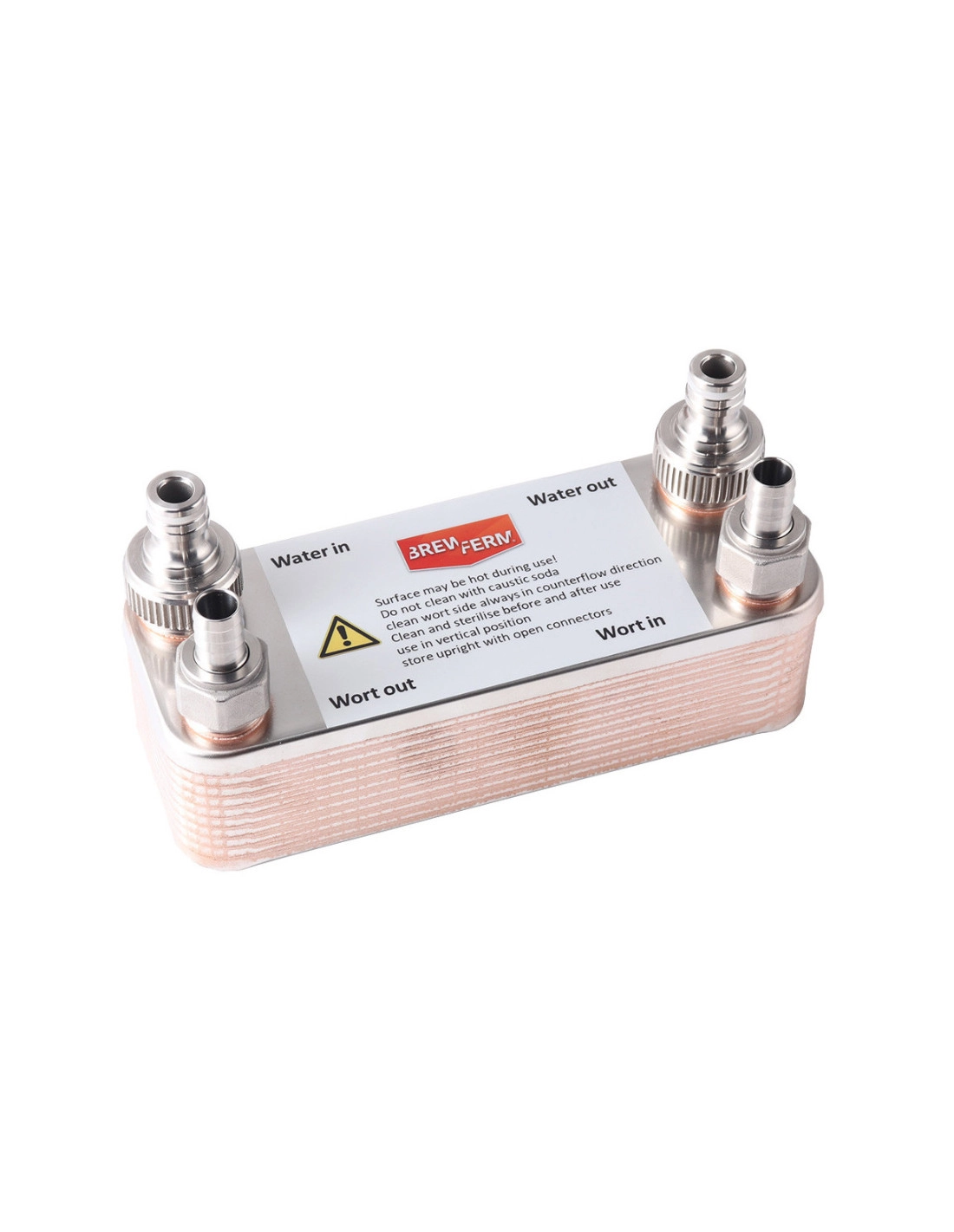 Utiliser le refroidisseur de moût à plaques Brewferm en position verticale, avec l’entrée du moût en dessous pour éviter que l’air ne soit bloqué dans l’échangeur de chaleur.