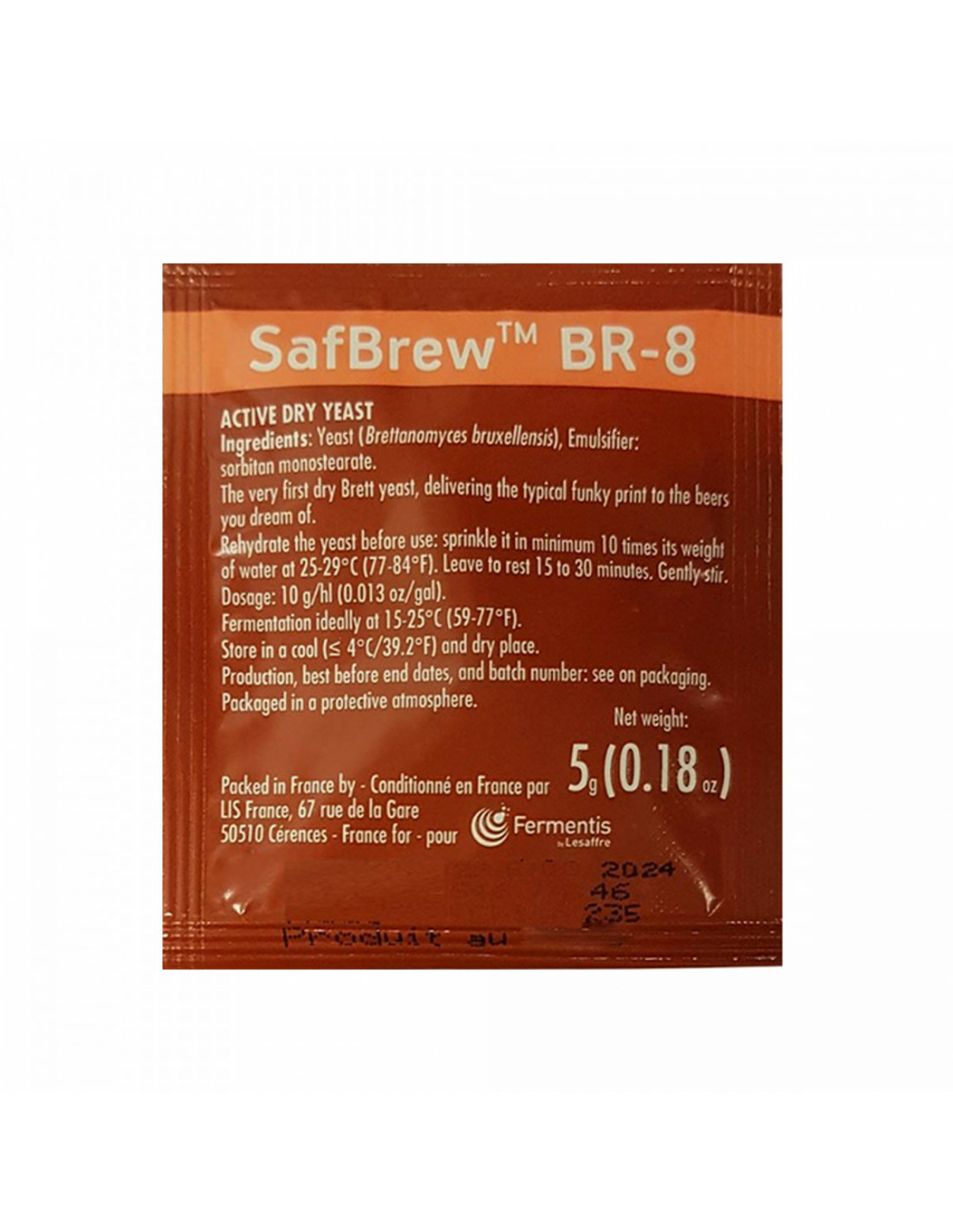 Réhydratation : SafBrewTM BR-8 ne doit pas être réhydratée directement dans la bière. Pulvérisez sur la levure environ 10 fois son poids en eau stérile à une température de 25 °C à 29 °C (77 °F à 84,2 °F). Laissez reposer 15 à 30 minutes Remuez doucement jusqu’à obtenir une levure crémeuse avant de l’ajouter à la bière. Ne pas utiliser en refermentation lorsque la fermentation primaire est effectuée avec une levure maltotriose négative en raison de la quantité résiduelle de maltotriose à la fin de la fermentation.