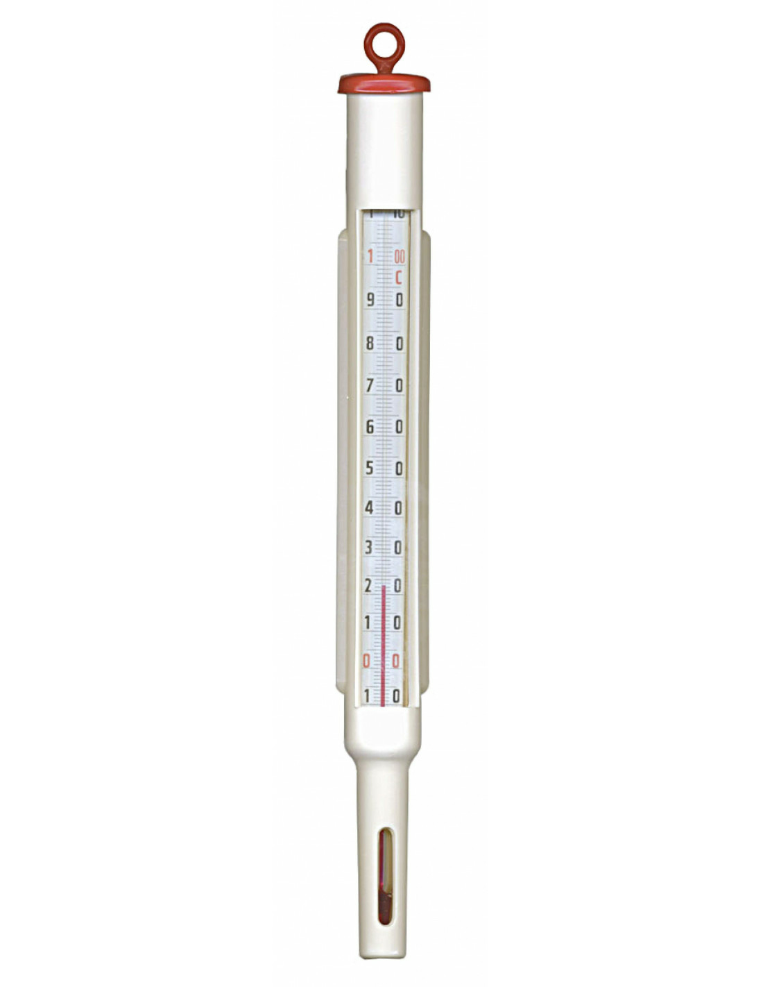 Thermomètre plus gros à gaine protectrice en plastique avec crochet. Idéal comme thermomètre de brassage. Facile à démonter pour nettoyage. A alcool rouge pour lecture facile.